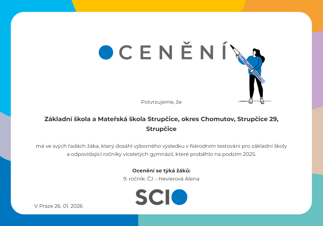 Naše žákyně 9. třídy Alena Hevierová dosáhla 2. nejlepšího výsledku v kraji v testování Čj. Gratulujeme!